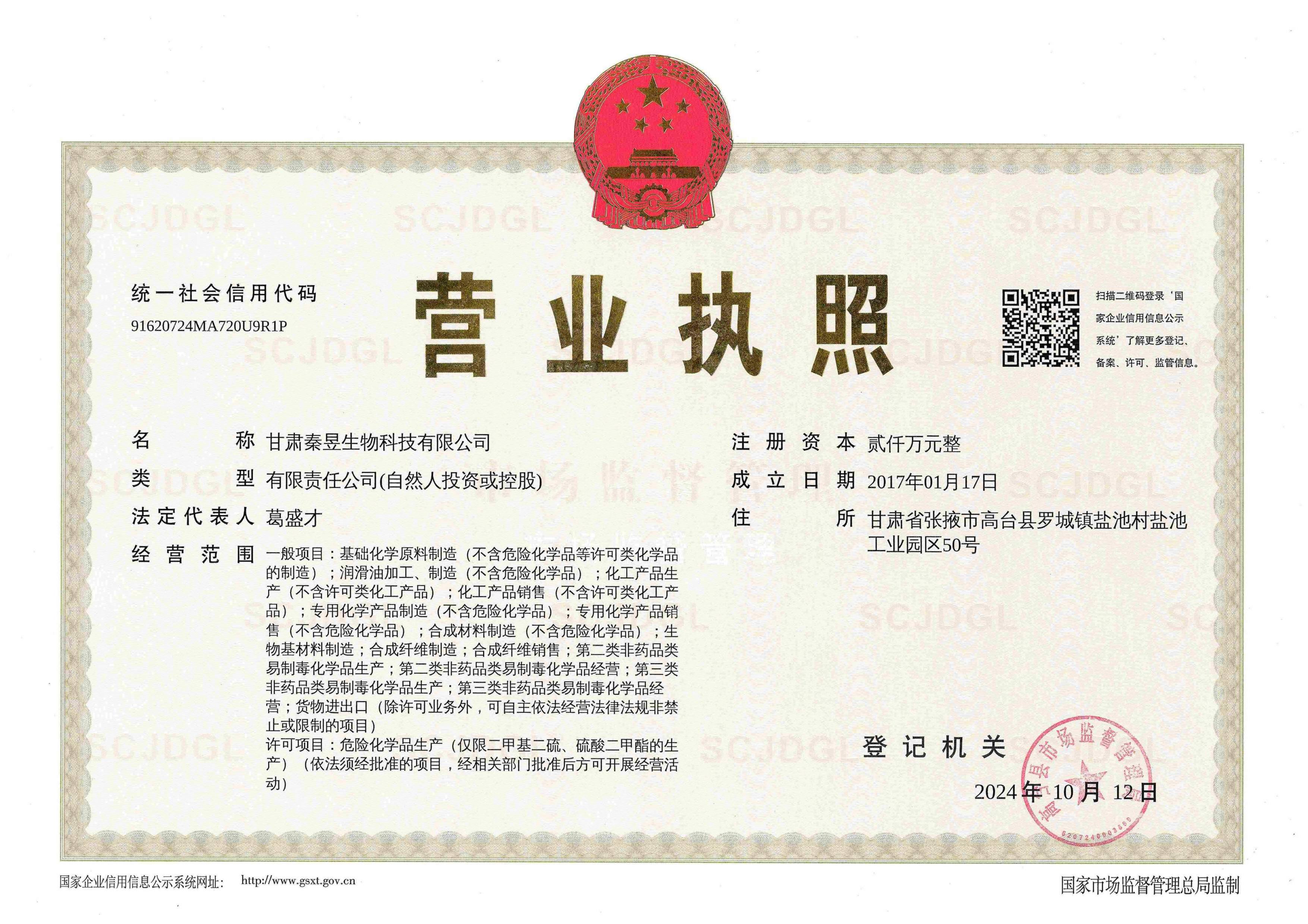 甘肃秦昱生物科技有限公司成立于2017年1月,坐落于甘肃省张掖市高台县盐池工业园区,注册资本2000万元,占地面积120亩,建筑面积23000平方米。公司现有员工75人,其中大专及以上学历42人,专业技术人员22人,是一家深耕硫化工领域,集研发、生产、销售于一体的国家高新技术企业、省级专精特新企业。